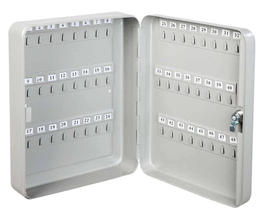 Key cabinets made of stamped steel and painted with epoxy powder coating. Wall fixable. Numbered coded Key Lock.