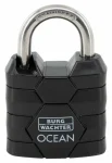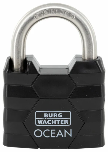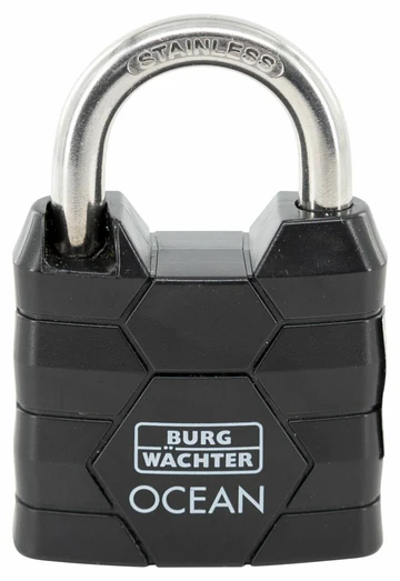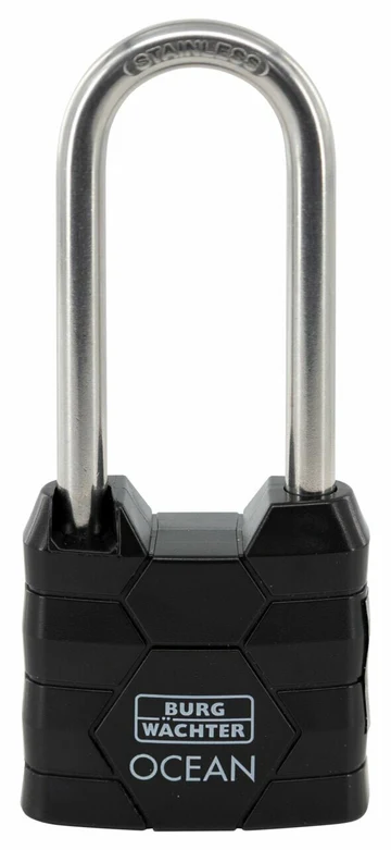 The Ocean lock features a solid, coated brass body and is ideal for securing gates and much more. The lock’s shackle is made of hardened steel and has a double locking mechanism for added security.The lock itself is completely rustproof, guaranteeing long-lasting functionality – perfect even in demanding environments. The innovative plastic sheathing, which consists of 70% recycled material, also protects the lock from external influences such as knocks or scratches, while protecting the surface of the items to be secured.The high number of possible locking options offers even more security. It is also available with a central locking system.