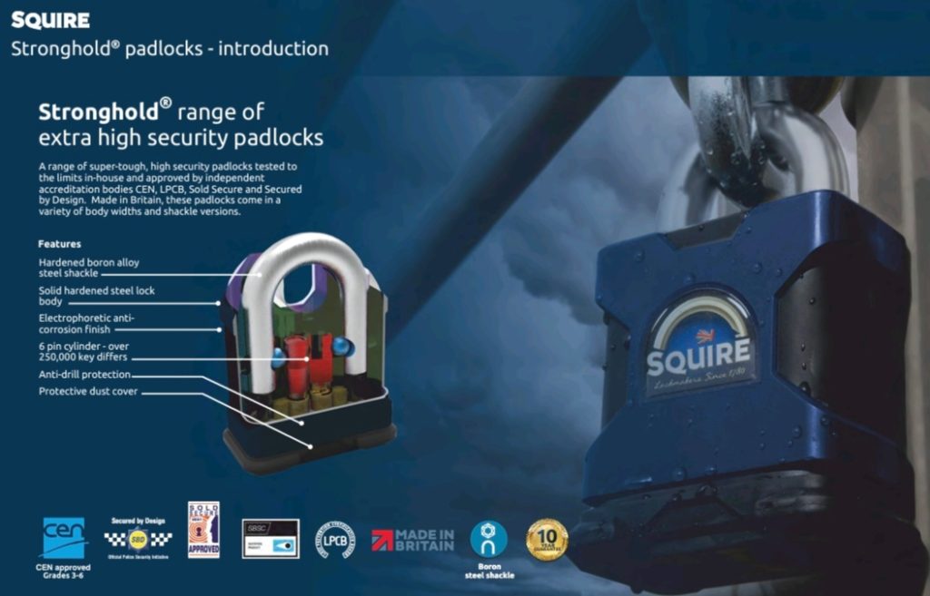 The mighty Stronghold® SS100cs is our flagship product, considered to be the world’s strongest padlock achieving the highest possible independent LPCB, CEN, Sold Secure and Secured by Design ratings.